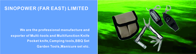 SINOPOWER (FAR EAST) LIMITED is an export company specializing in multi-tools, camping knives, chrome-plated wire and BBQ tools, manicure sets, kitchen knives and tool sets. With our partnership factories and quality control, we make sure price, quality and production times meet our global customers' requirements. These customers include catalogue importers, wholesalers, promotion and mail order companies. |